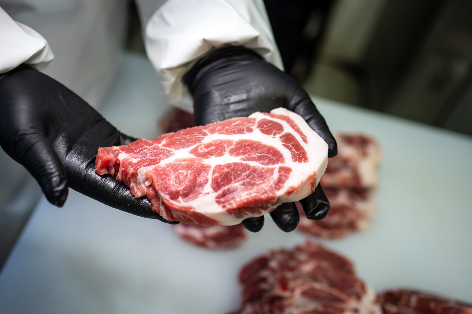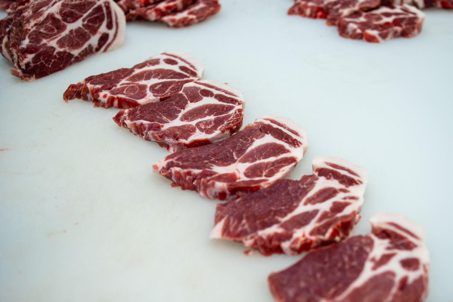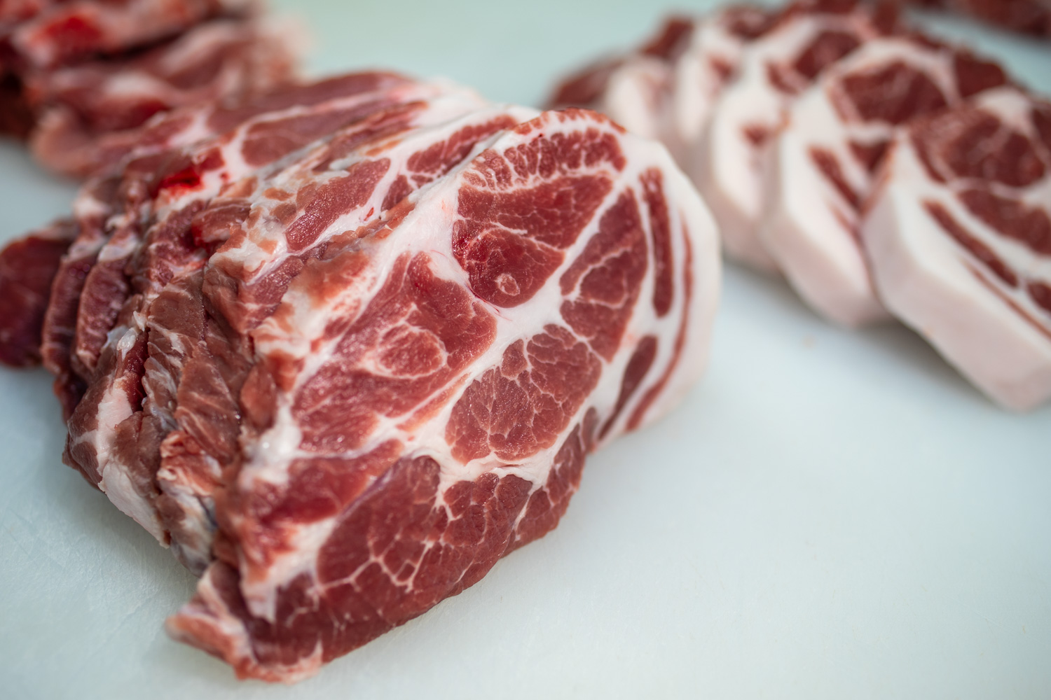 하하농장 흑돼지 목살입니다. 대충 이런 식으로 나옵니다. 사료조절이 잘 되면 위 사진처럼 근내지방이 풍부한 목살이 됩니다. 그리고 흑돼지의 특성상 살코기가 아주 붉게 나옵니다.