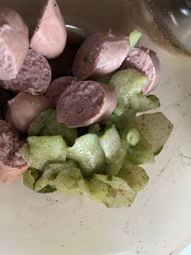 소시지 통째로 베어먹어도 좋지만, 칼로 한 입 크기로 잘라서 먹어도 됩니다. 그리고 이미 익은 상태여도 자른 상태에서 다시한번 프라이팬에서 익혀서 드셔도 됩니다. ^^