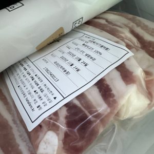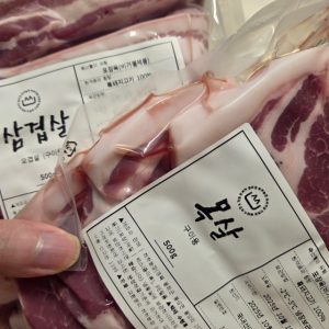 삼겹살의 앞부분과 뒷부분은 모양이 다소 다릅니다. 앞부분과 뒷부분 골고루 넣고 있습니다. 돼지의 크기에 따라 조금씩 다르지만, 3장 + 자투리가 들어갑니다. 무게를 맞추기 위해 다소 작은 덩어리가 들어갈 수도 있습니다.