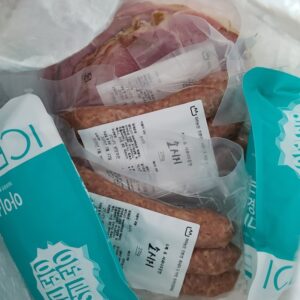 돼지고기(하하농장 흑돼지), 천연돈장(미국산), 천일염(국산), L-아르기닌, 피클링솔트(보존료), 아스코브산나트륨(비타민C), 유기농설탕, 흑후추(말레이시아), 넛맥(말레이시아), 고수잎(독일), 생강가루(페루), 파프리카가루(국산)